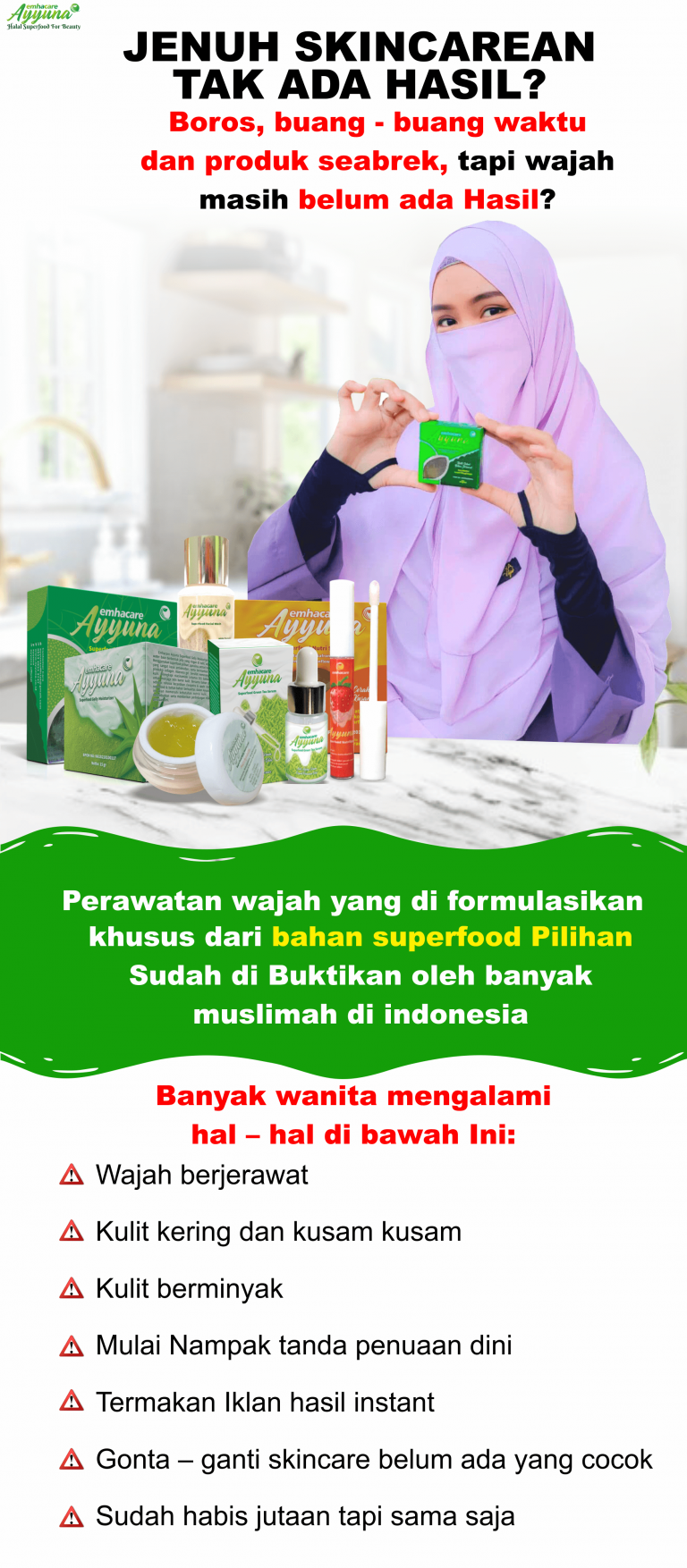 Ayyuna adalah skincare natural berkualitas , sudah memiliki ijin BPOM dan harga terjangkau. Jika Anda seorang muslim tentunya , Anda menginginkan setiap aktivitas serta materi yang anda keluarkan untuk merawat diri tentunya bernilai pahala dan sebagai penyempurna ibadah, serta tentunya Anda ingin memberikan perawatan kulit yang tepat sesuai dengan kebutuhan kulit dengan bahan2 dari alam yang halal dan thoyyib . Dan rangkain skincare ayyuna bisa didapatkan dengan harga terjangkau .