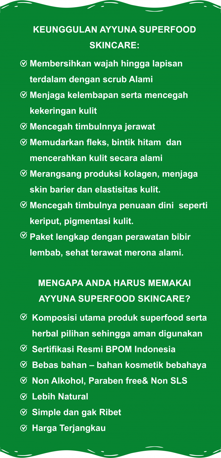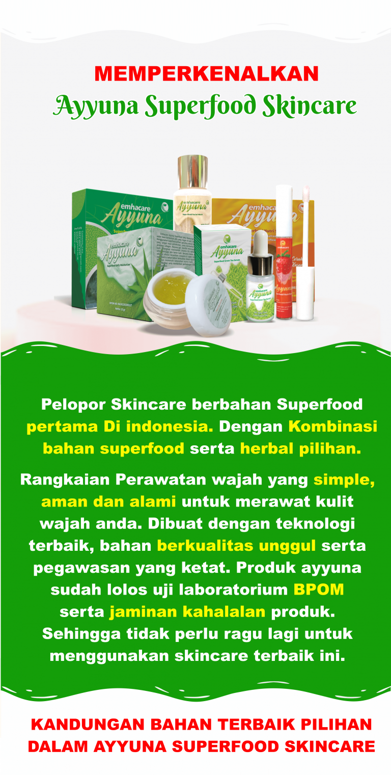 Sehingga ayyuna adalah skincare natural dengan pemilihan bahan bahan superfood dan bahan alami pilihan di proses berstandar pabrik yang sudah terstandar . Bebas dari bahan bahan berbahaya .